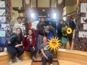 On the following visit to Penelakut, we practiced Hul’q’umi’num names and phrases with guidance from Jeannine Georgeson and the Classroom teacher Cayla Hoefsloot. We learned and laughed together as Fergus the Fungus tried his hand at speaking Hul’q’umi’num and the student characters responded with their Hul’q’umi’num names.